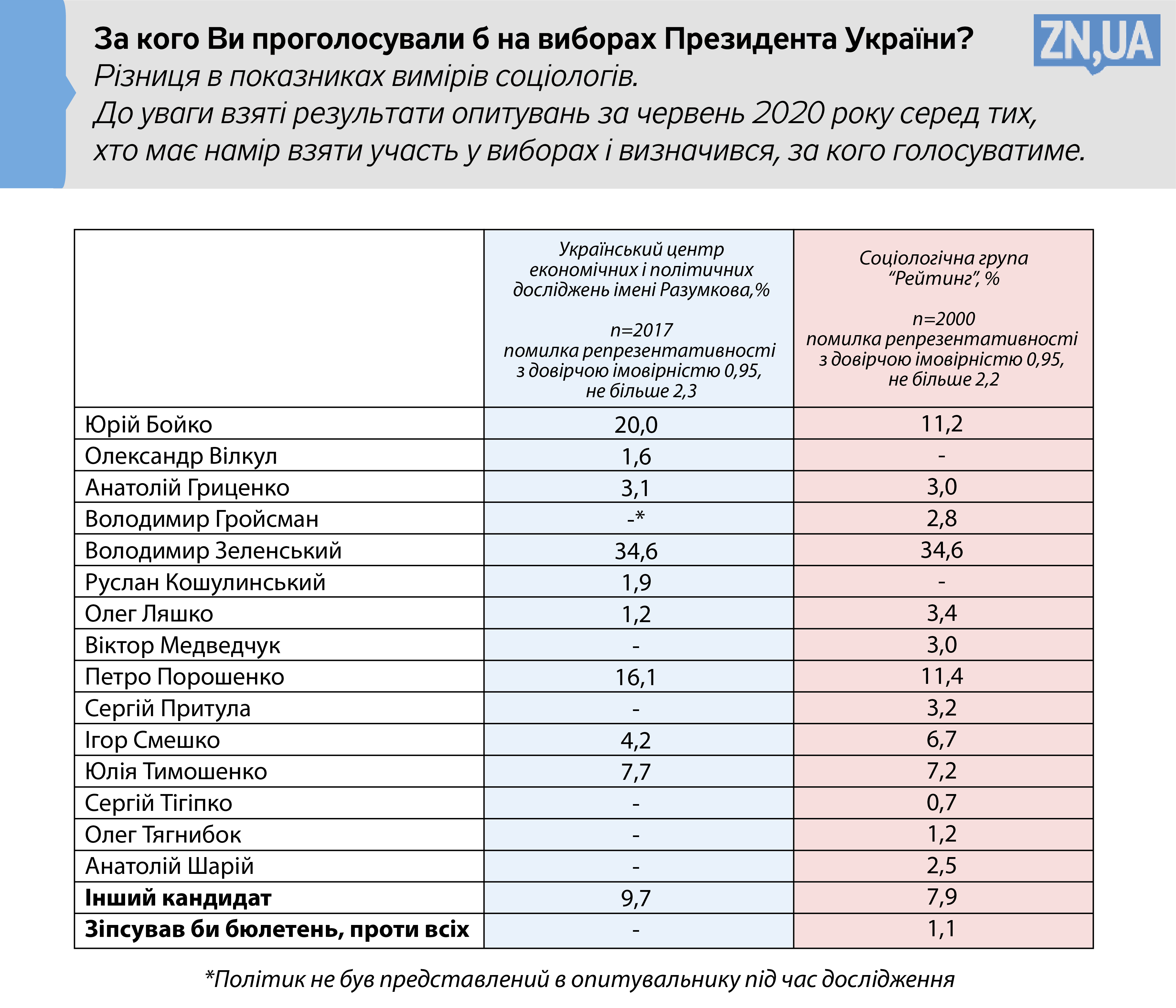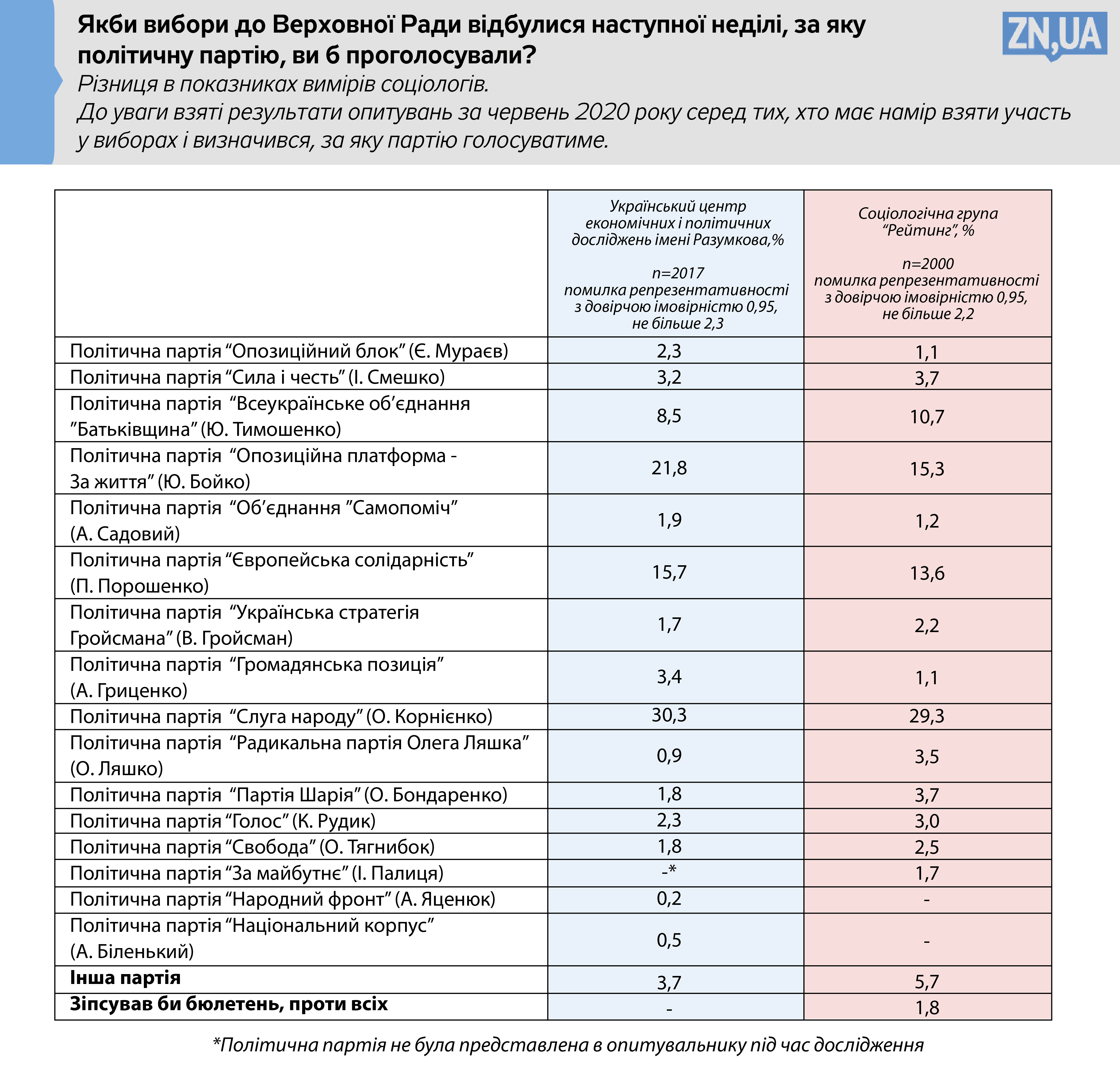В кінці червня Центр Разумкова і Соціологічна група «Рейтинг» провели опитування на предмет того, за кого б українці проголосували на найближчих президентських і парламентських виборах. ZN.UA дає можливість нашим читачам вивчити різницю в показниках вимірів соціологів, і відстежити динаміку показників провідних політиків і партій.
