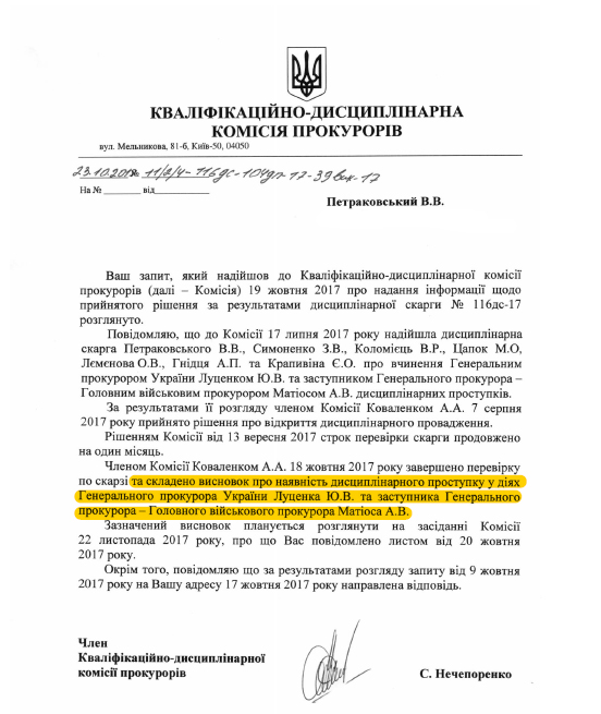 "Членом Комісії Коваленком А. А. 18 жовтня 2017 року завершено перевірку за скаргою та складено висновок про наявність дисциплінарного проступку у діях генерального прокурора України Луценка Ю. В. та заступника генерального прокурора - головного військового прокурора Матіоса А. В. Зазначений висновок планується розглянути на засіданні комісії 22 листопада 2017 року", – йдеться в листі члена комісії Сергія Нечепоренка від 20 жовтня 2017 року, яке надали "Українській правді" ініціатори дисциплінарного провадження Володимир Петраковский і Злата Симоненко.