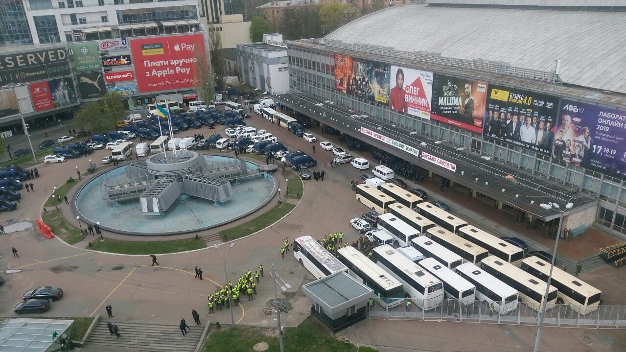 Сьогодні вранці на НСК "Олімпійський" прибули підрозділи поліції, а також автомобілі з телевізійним обладнанням для трансляції дебатів між кандидатами в президенти Петром Порошенком і Володимиром Зеленським. Також було перекрито рух на деяких вулицях.