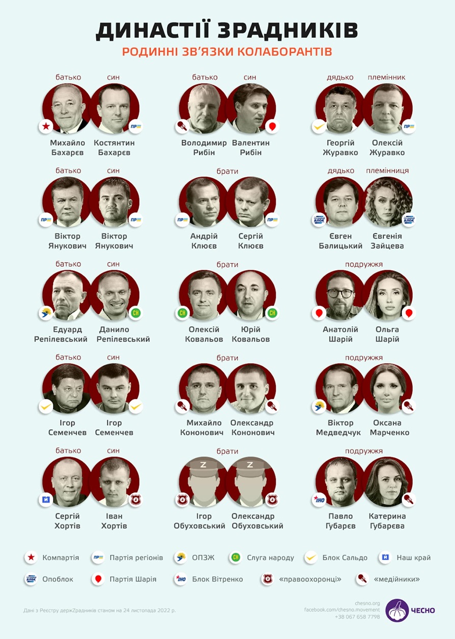 Журналісти руху «Чесно» дослідили родинні зв’язки осіб, які потрапили до Реєстру Держзрадників. З’ясувалося, що нині таких осіб налічується три десятка. І більшість з них першої лінії.
