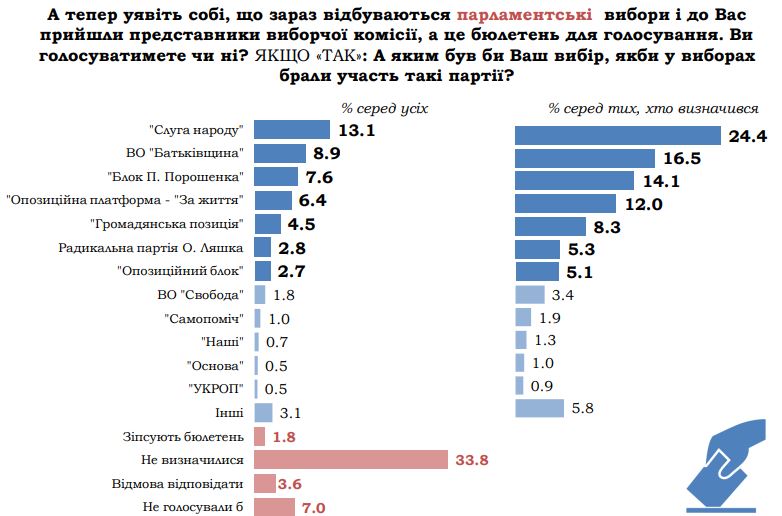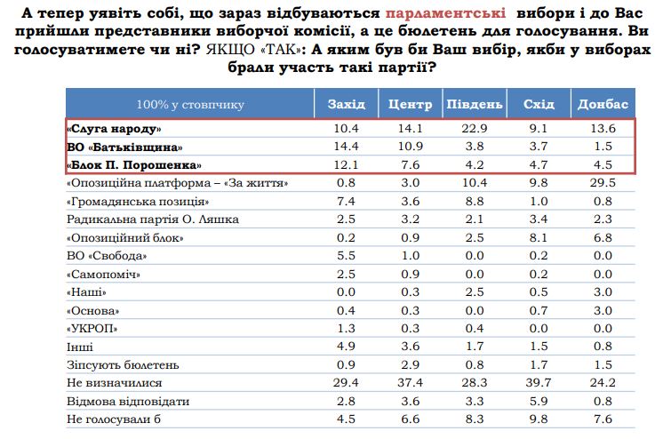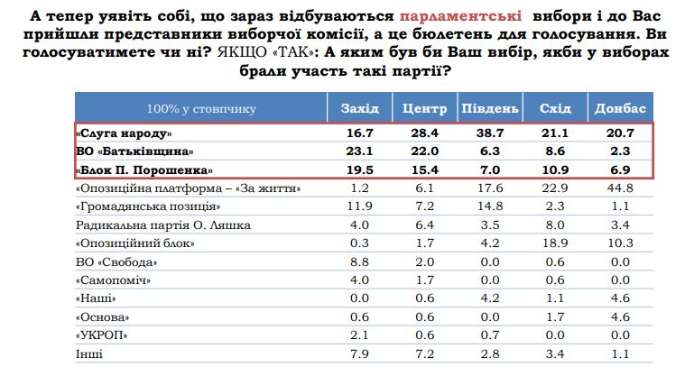 Зокрема серед тих, хто збирається голосувати і уже визначився із своїм вибором за партію "Слуга народу" збирається віддати свої голоси 24% громадян, на другому місці ВО "Батьківщина" з 16,5% підтримки, "Блок П. Порошенка" підтримують 14%, "Опозиційна платформа – "За життя" набере 12%, "Громадянська позиція" 8%), Радикальна партія 5% та "Опозиційний блок" 5%.