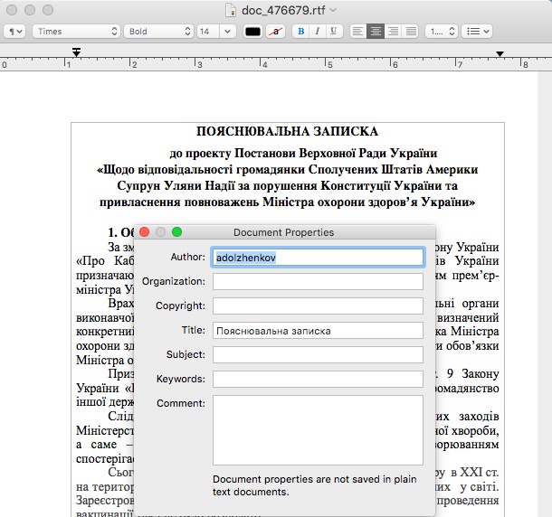 Пакет Microsoft Office, за допомогою якого було створено документ, зареєстрований на Олександра Долженкова. У фракції "Оппоблока" є депутат з таким ім'ям.