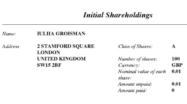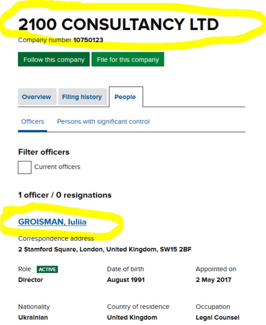 Донька українського прем'єр-міністра, який нещодавно розповів, що здобував вищу освіту заочно, бо рано створив сім'ю, Юлія Гройсман у травні 2017 зареєструвала у Лондоні власну фірму "2100 consultancy ltd". Згідно з даними британського реєстру "Companies House", Юлія Гройсман є директором і єдиним власником цієї фірми з уставним капіталом у розмірі 1 фунт стерлінгів, а сама фірма зареєстрована на Stamford Square, 2, SW15 2BF, повідомляють "Наші гроші".