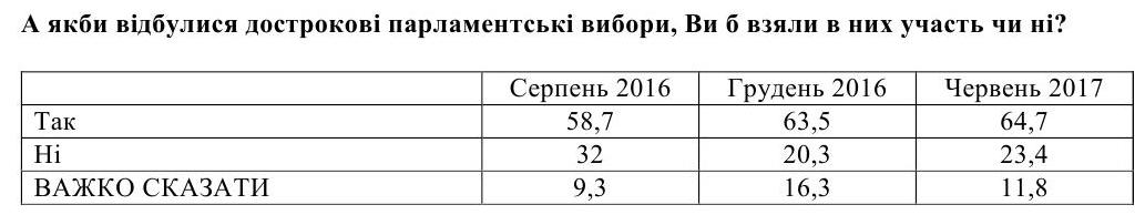 На початку червня 2017 року майже половина українців (48%) підтримували ідею розпуску парламенту і призначення нових виборів Верховної Ради, 34% не підтримували цю ідею, свідчать дані опитування фонду "Демократичні ініціативи" і Центра Разумкова.