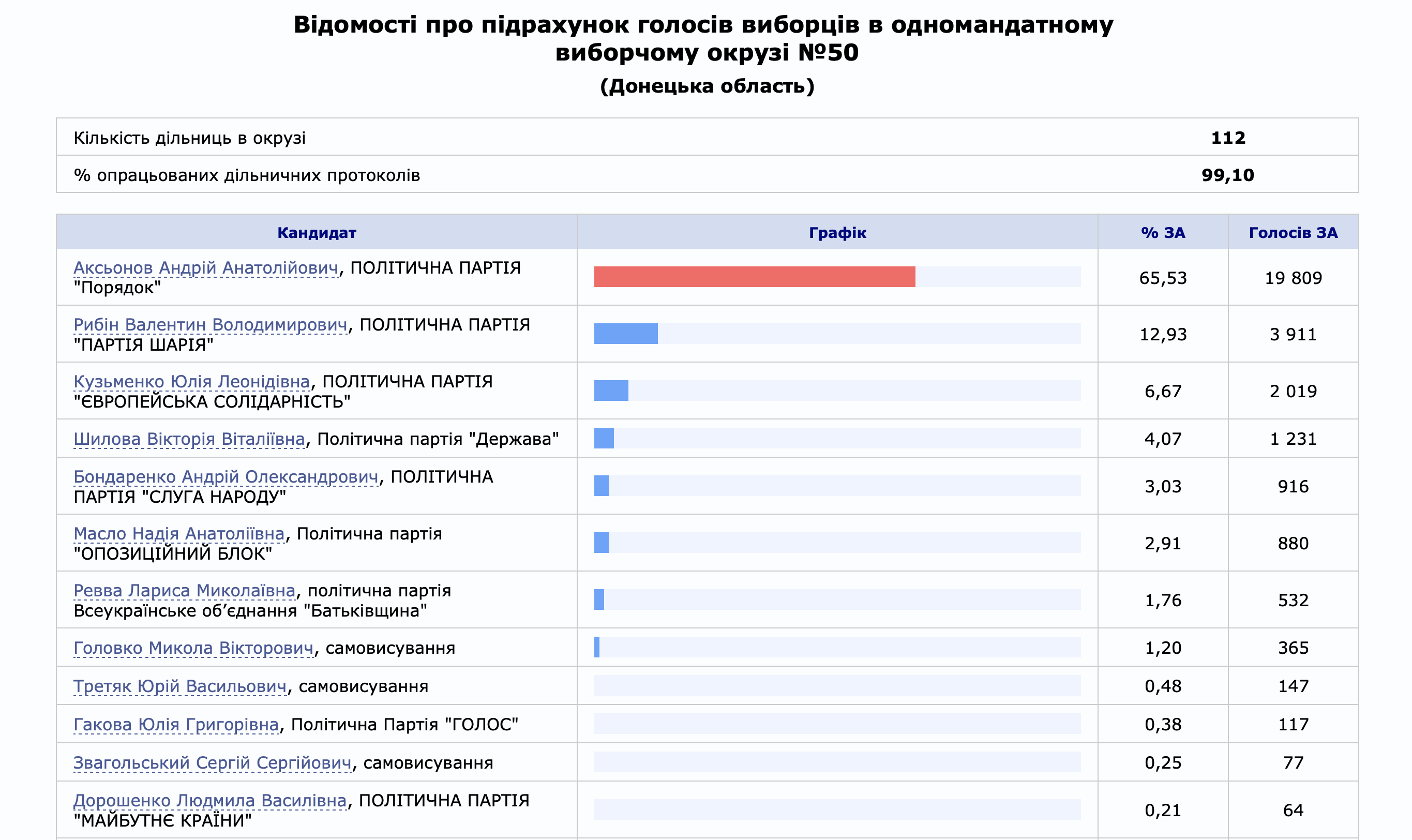 За результатами підрахунку 99,10% бюлетенів в одномандатному виборчому окрузі №50 (Донецька область) на довиборах у Верховну Раду перемагає міський голова Добропілля, представник партії "Порядок" Андрій Аксьонов. Про це йдеться на сайті Центральної виборчої комісії.