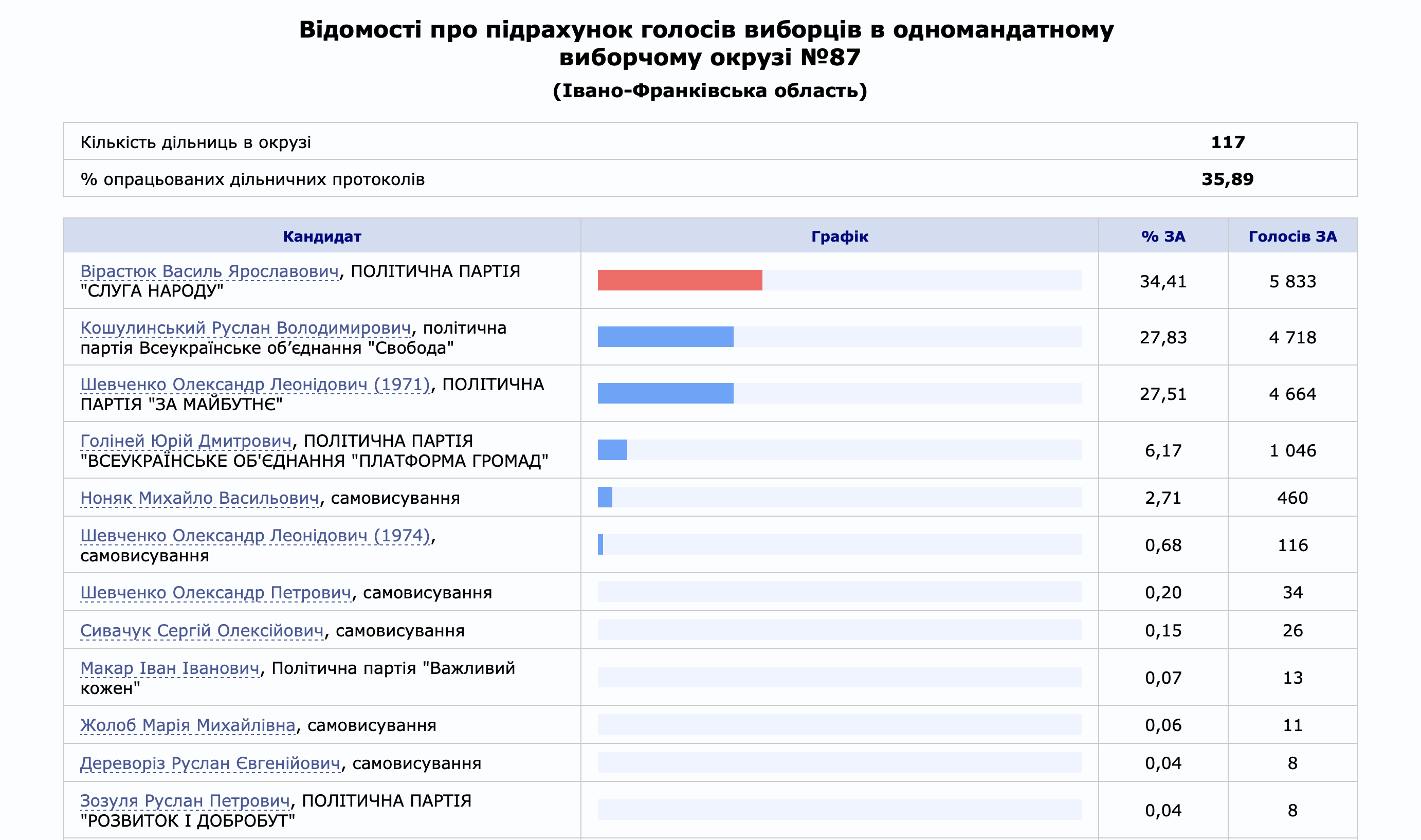 На довиборах в одномандатному виборчому окрузі № 87 в Івано-Франківській області наразі лідерство зберігає кандидат від політичної партії "Слуга народу" Василь Вірастюк. З невеликим відривом за ним йдуть представник ВО "Свобода" Руслан Кошулинський та кандидат від партії "За майбутнє" Олександр Шевченко. Їх підтримали 27,83% та 27,51% виборців відповідно.
