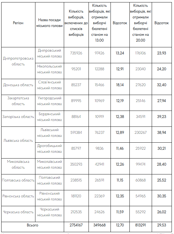 Цей показник вищий, ніж минулої неділі, коли мерів у другому турі обирали мешканці семи міст. Але нижче, ніж у день місцевих виборів 25 жовтня.