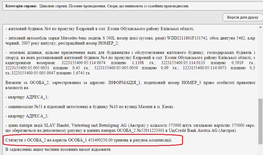 Також з Сергія Клюєва на користь Ірини Клюєвої стягується 451,50 млн грн. компенсації. При цьому, чого стосується ця компенсація в рішенні суду не уточнюється. Зазвичай компенсація має місце, коли мова йде про майно, яке неможливо розділити.