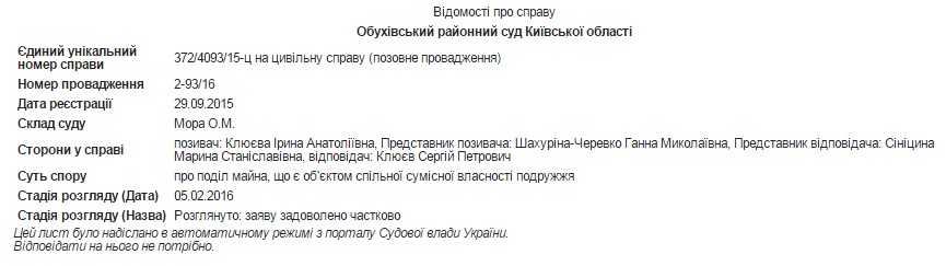 Розділ майна здійснено за позовом Ірини Клюєвої. У рішенні сказано, що позовні вимоги задоволені частково, ще вимоги мала екс-дружина Клюєва невідомо. В реєстр нерухомості дані про зміну власників майна ще не внесені.