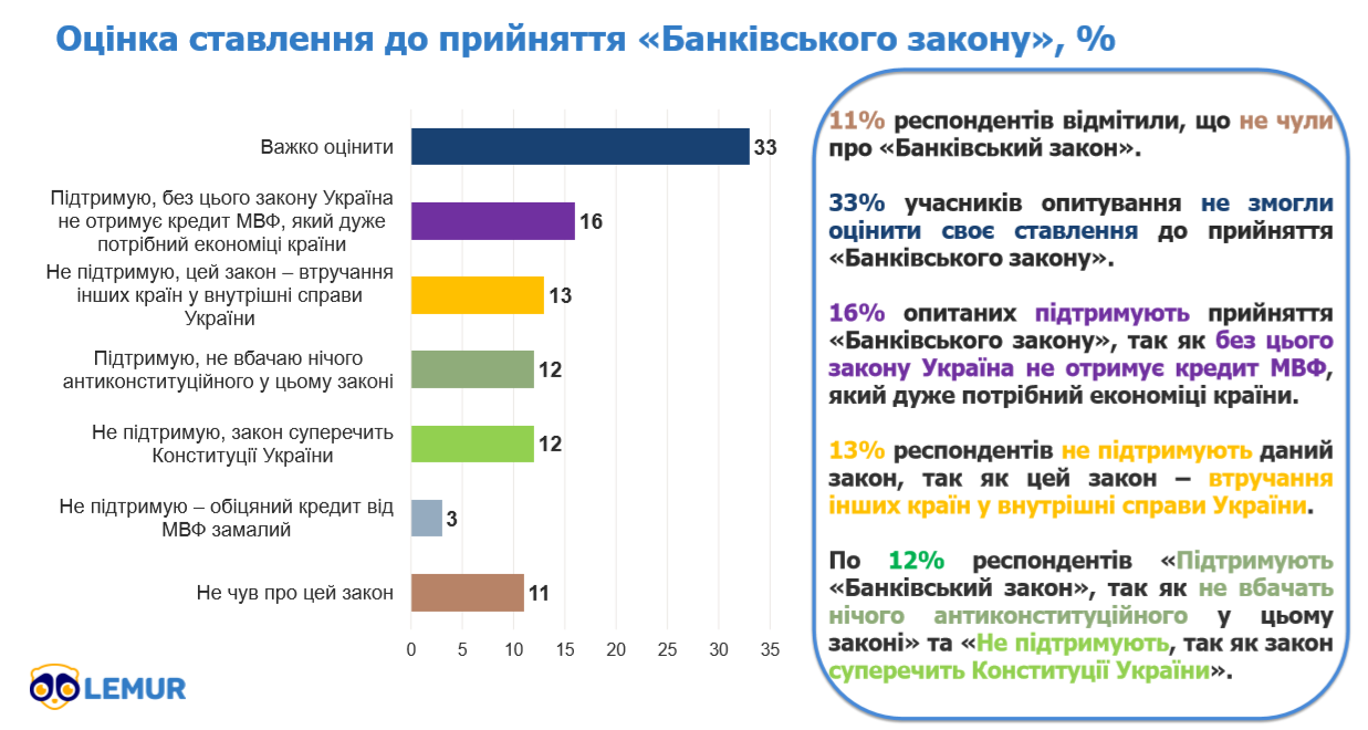 На початку травня Верховна Рада ухвалила так званий "антиколомойський" закон, який забороняє повертати націоналізовані банки, колишнім власникам. Однак, згідно з результатами опитування проведеного "Нью Імідж Маркетинг Груп" на базі додатку Lemur, 11% українців взагалі не чули про банківський закон. Ще 33% громадян не змогли оцінити своє ставлення до прийняття закону.