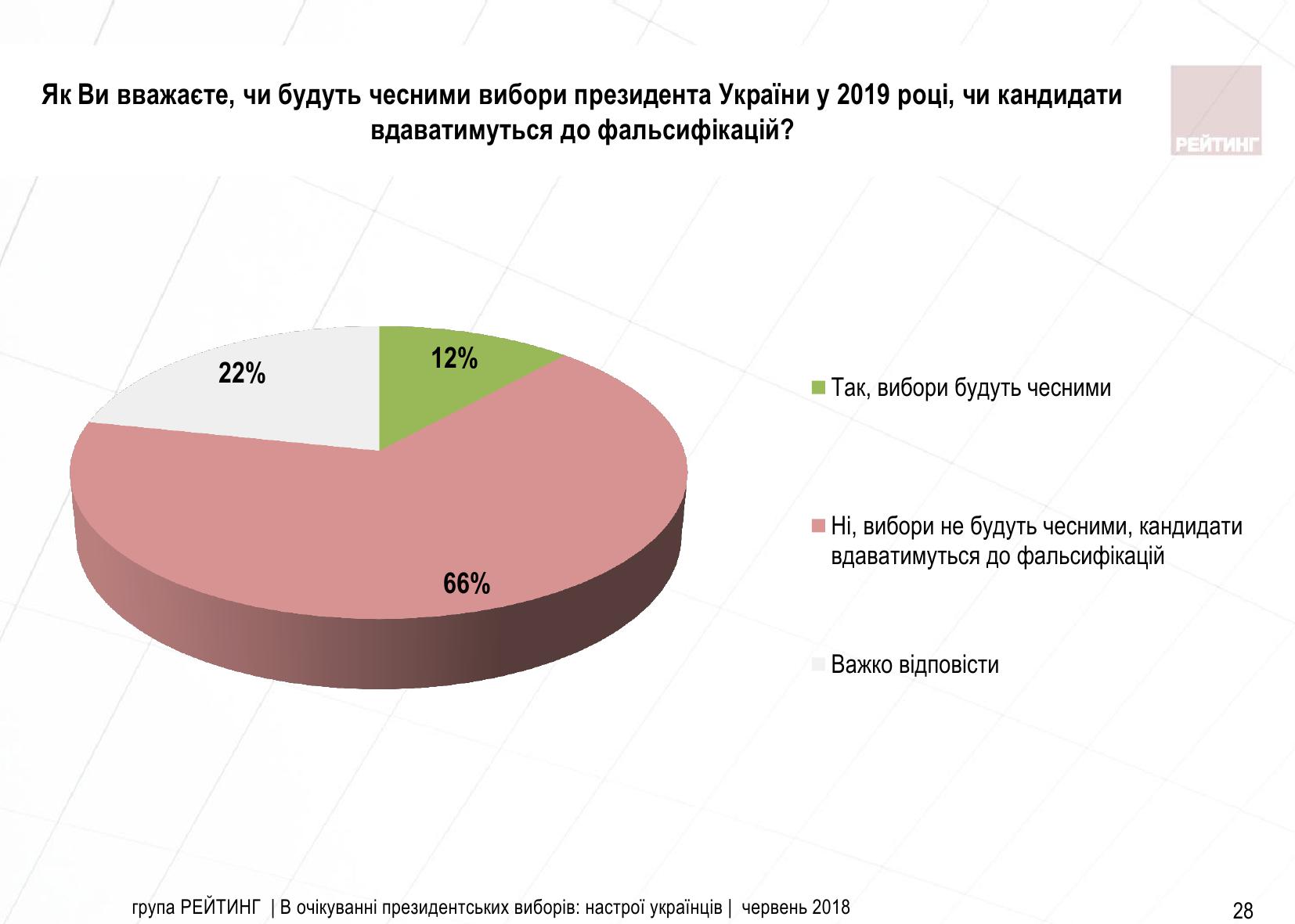 Дві третини громадян (66%) вважають, що майбутні вибори президента України будуть нечесними, а кандидати вдадуться до фальсифікацій, свідчать дані опитування Соціологічної групи "Рейтинг".