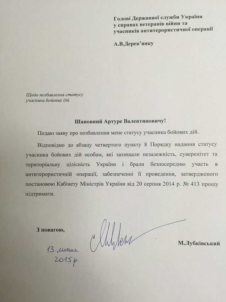 "Подаю заяву про позбавлення мене статусу учасника бойових дій", - сказано в заяві Маркіяна Лубківського, яке також датований сьогоднішнім числом.