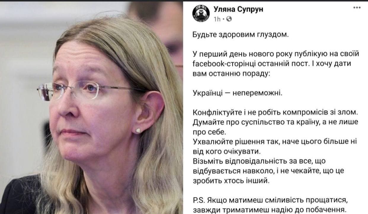 "У перший день нового року публікую на своїй сторінці останній пост. І хочу дати вам останню пораду: Українці - непереможні. Конфліктуйте і не робіть компромісів зі злом. Думайте про суспільство і країну, а не тільки про себе", - написала Супрун.