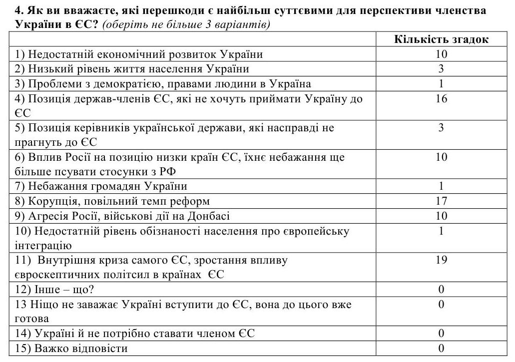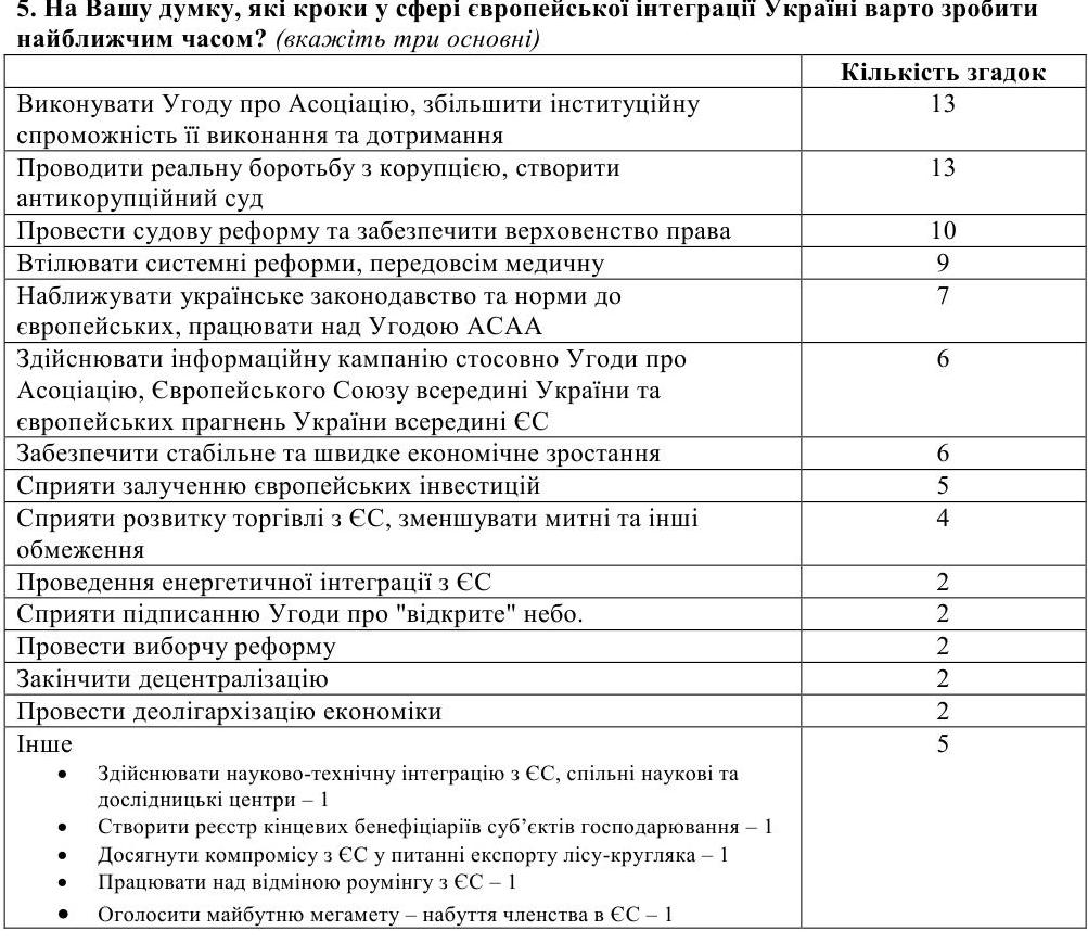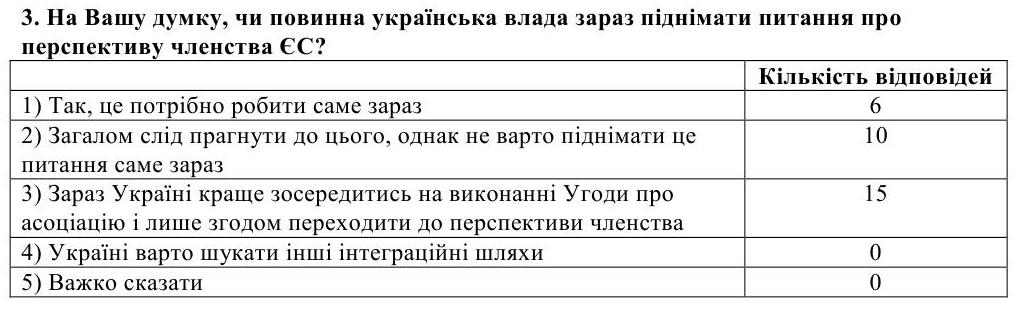 На думку половини експертів, Україні зараз краще зосередитись на виконанні Угоди про асоціацію з ЄС і лише згодом переходити до постановки питання щодо перспективи членства. Ще третина експертів вважають, що загалом країні слід прагнути до членства в ЄС, однак не варто піднімати питання перспективи членства саме зараз. Лише шість експертів вважають що Україні потрібно піднімати питання перспективи членства прямо зараз.