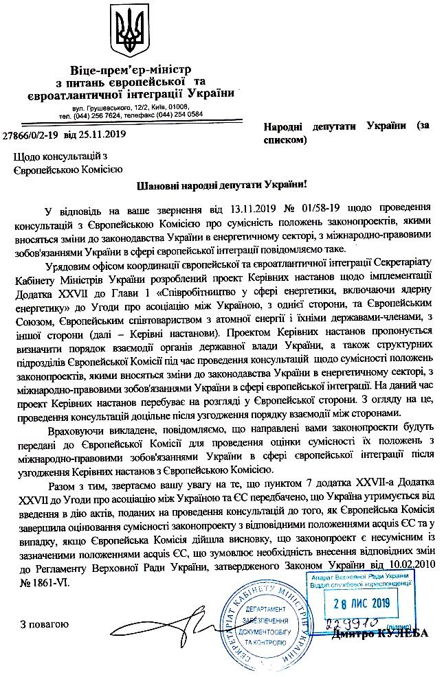 "Повідомляємо, що направлені вами законопроекти будуть передані до Європейської Комісії для проведення оцінки сумісності їх положень з міжнародно-правовими зобов'язаннями України в сфері європейської інтеграції після узгодження Керівних настанов з Європейською Комісією", - йдеться в листі Кулеби.