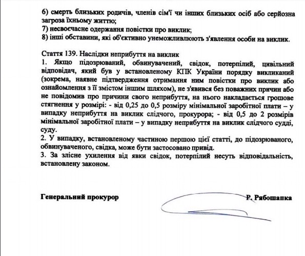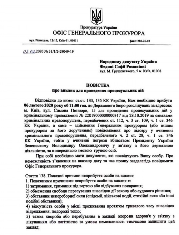 Вказується, що за дорученням генерального прокурора Руслана Рябошапки слідчий ДБР на 6 лютого викликав Федину для вручення письмового повідомлення. Повістка направлена за адресою її реєстрації, фактичного проживання та за місцем роботи.
