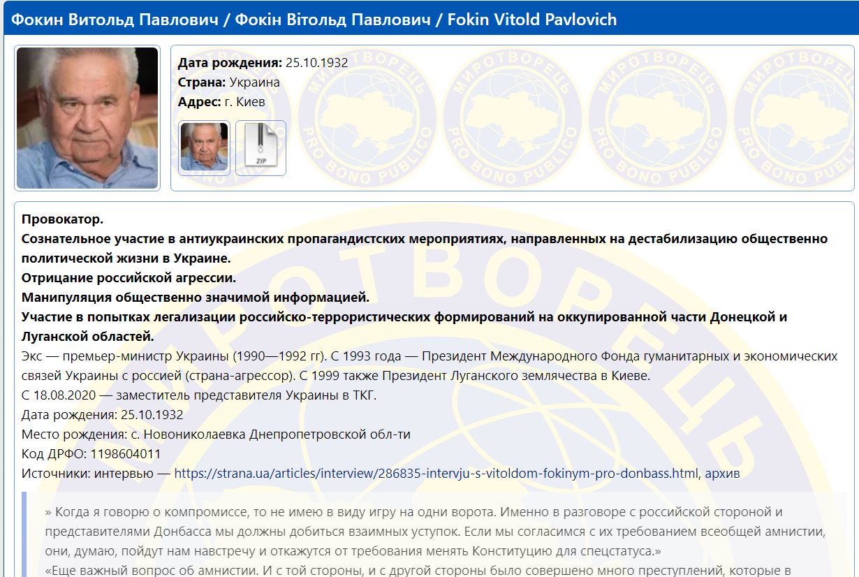 Першого заступника голови української делегації в Тристоронній контактній групі Вітольда Фокіна, після його висловлювань про загальну амністію і особливий статус для Донбасу, внесли в базу "Миротворця". Про це свідчить інформація на сайті порталу.