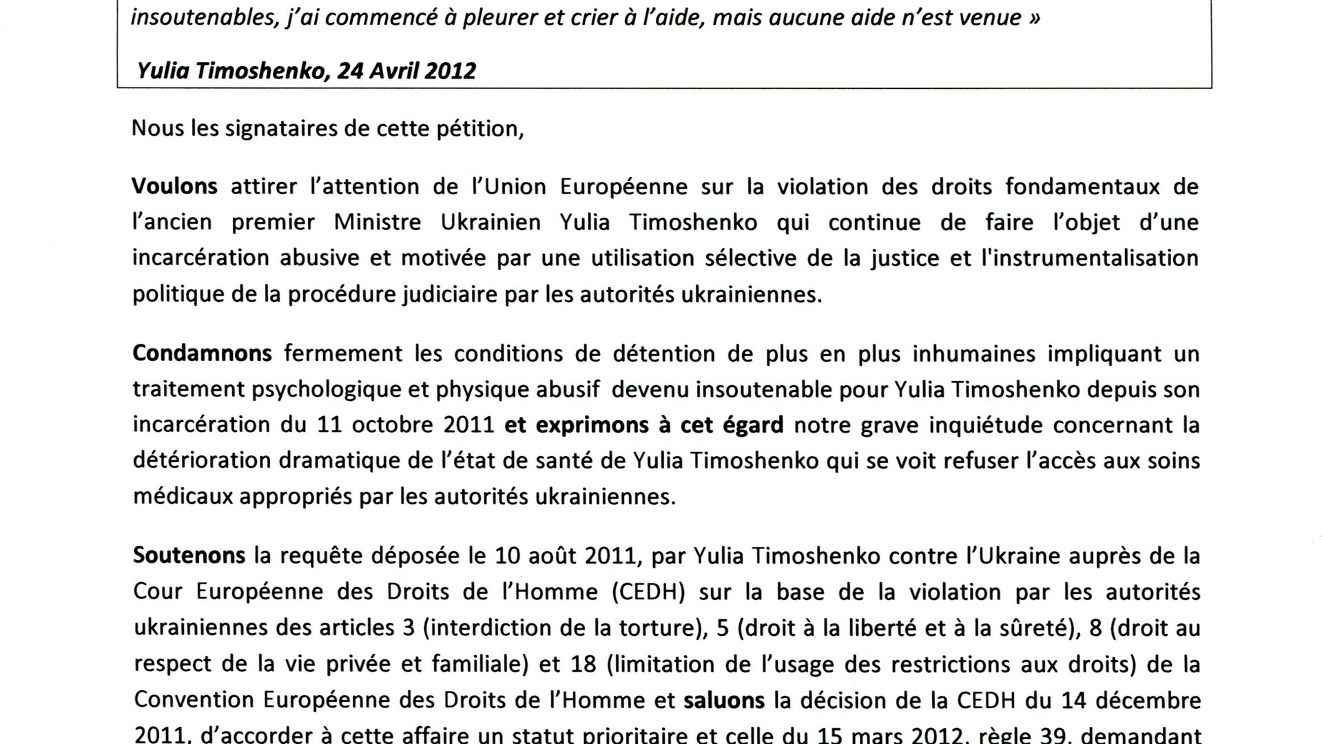 Автори і підписанти петиції закликають керівництво Євросоюзу ще раз "звернути увагу на порушення основоположних прав колишнього прем'єр-міністра України Юлії Тимошенко, яка залишається жертвою незаконного ув'язнення"