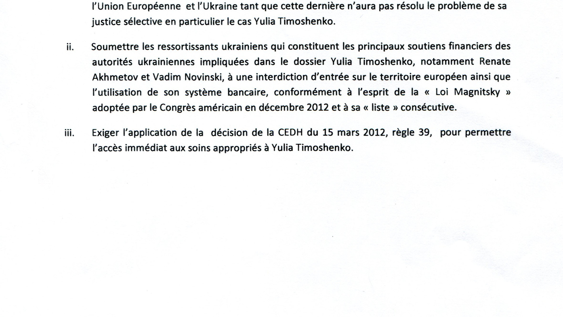 Шкодуємо, що численні політичні зусилля, докладені з боку Європейського Союзу, зокрема, в рамках виконання резолюції Європейського парламенту щодо ситуації в Україні (2012/2889 (RSP)) та спостережної місії Європейського парламенту в Україні з метою досягнення конкретних зрушень з боку українського уряду в сфері судової реформи та вирішення питання політично мотивованих судових переслідувань, зокрема, у випадку Юлії Тимошенко, досі не принесли очікуваних вагомих результатів, і наголошуємо в зв'язку з цим, що укладення угоди про зону вільної торгівлі між Європейським Союзом і Україною вимагає від останньої приєднання до спільних демократичних цінностей, таких як забезпечення верховенства права, дотримання прав людини, незалежності судової влади та свободи засобів масової інформації. Внаслідок чого просимо Європейський Союз відреагувати на серйозність ситуації з Юлією Тимошенко, яка демонструє неприпустимий випадок порушення основоположних прав в Європі, невідкладно вживши проти відповідних українських органів влади та осіб, які несуть в Україні відповідальність за незаконне утримання в неволі Юлії Тимошенко, наступні санкції: