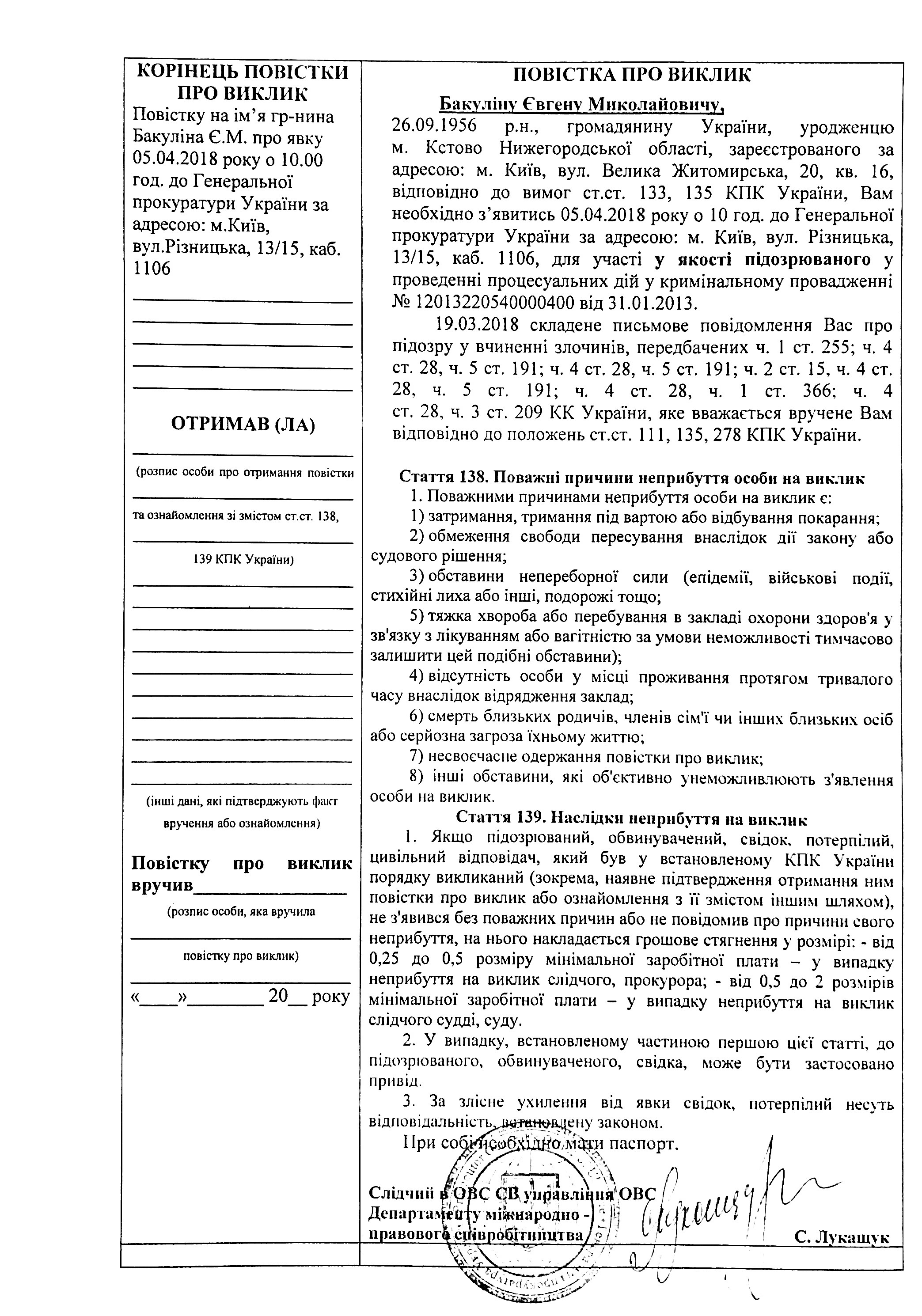 "Бакулін Євген Миколайович, відповідно до вимог ст. ст. 133, 135 КПК України, вам необхідно з'явитися 5 квітня 2018 року о 10-й годині до слідчого в особливо важливих справах Департаменту міжнародно-правового співробітництва Генеральної прокуратури України Лукащука С.В. для участі як підозрюваного у проведенні слідчих та процесуальних дій, пов'язаних з досудовим розслідуванням у кримінальному провадженні", - йдеться у повістці.