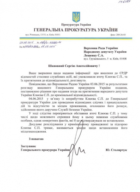 Генпрокуратура України не знайшла винних у втечі народного депутата Сергія Клюєва, йдеться в листі ГПУ у відповідь на звернення народного депутата Сергія Лещенка, передає "Українська правда".
