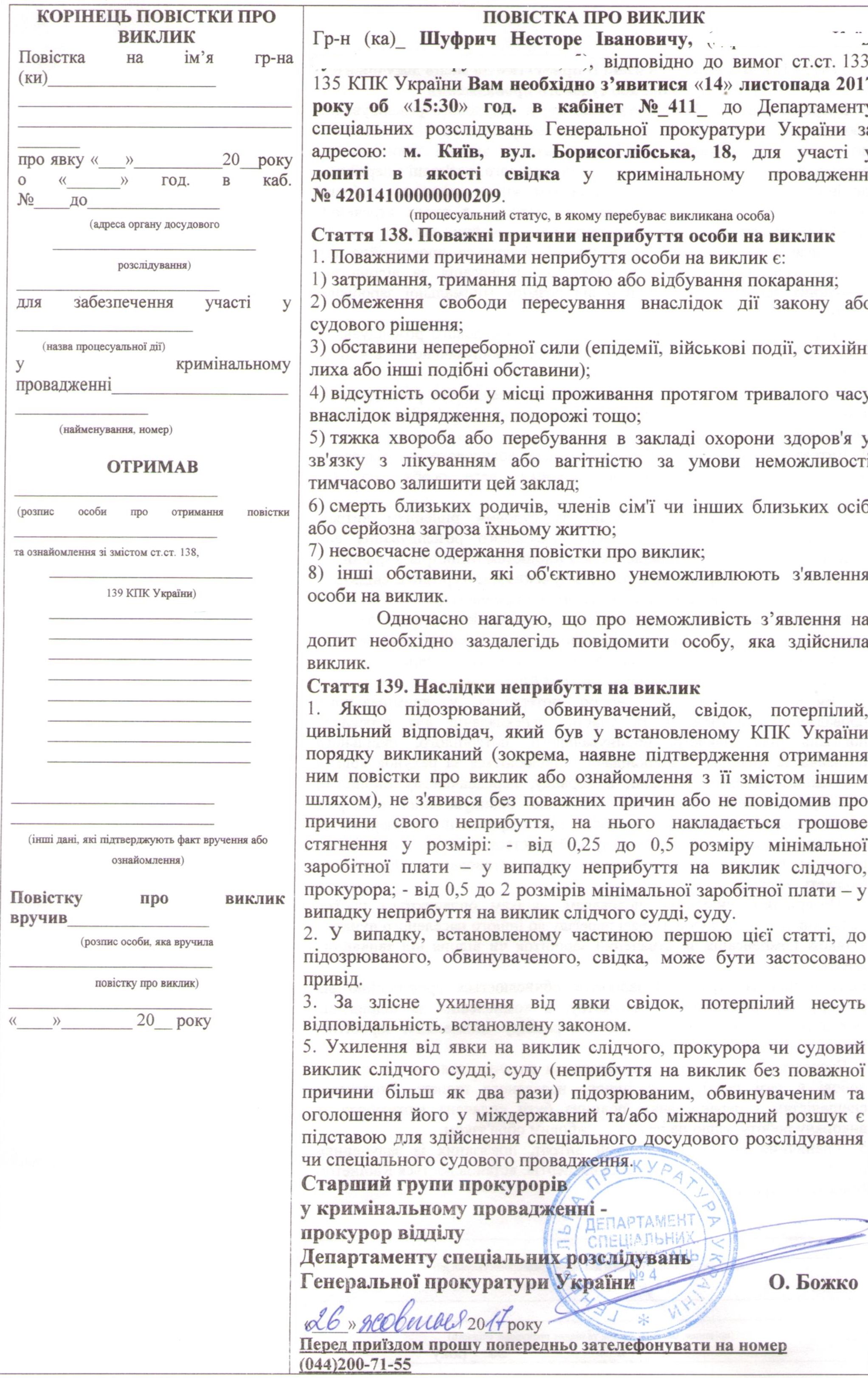 "Відповідно до вимог ст. 36, 135 Кримінально-процесуального кодексу України, народному депутату України Шуфричу Н.І. необхідно прибути 14 листопада 2017 року о 15:30 до Департаменту спеціальних розслідувань Генеральної прокуратури України для участі в допиті в якості свідка у кримінальному провадженні № 42014100000000209", - сказано в повідомленні.