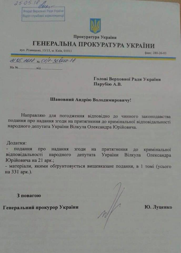 Генеральний прокурор Юрій Луценко вніс у Верховну Раду України подання про дачу згоди на притягнення до кримінальної відповідальності народного депутата від фракції "Опозиційний блок" Олександра Вілкула. Про це в п'ятницю повідомила у Facebook прес-секретар генпрокурора Лариса Сарган.