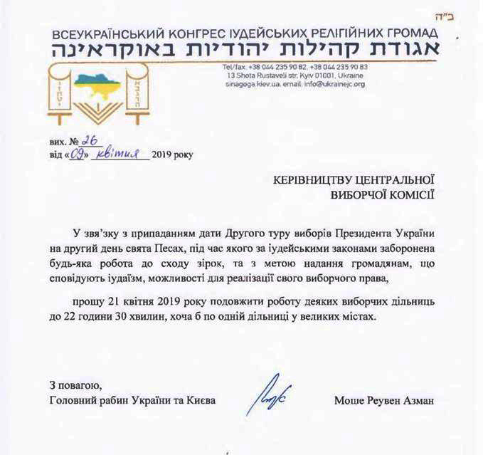 Головний рабин України і Києва Моше Реувен Азман розмістив на своїй офіційній сторінці в Facebook копію листа, який він направив до Центральної виборчої комісії. У листі Головний рабин просить продовжити час роботи виборчих дільниць у зв'язку з релігійним святом іудеїв Песах.