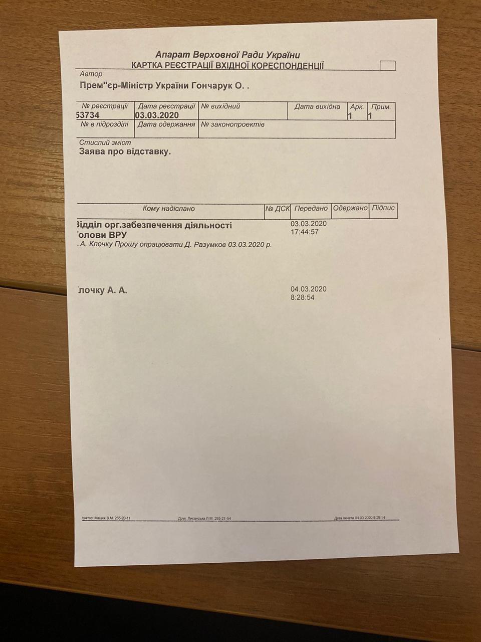 Олексій Гончарук написав заяву про відставку з посади прем'єр-міністра України вранці у вівторок, 3 березня. Джерело ZN.UA опублікувало фотографію відповідного документу.