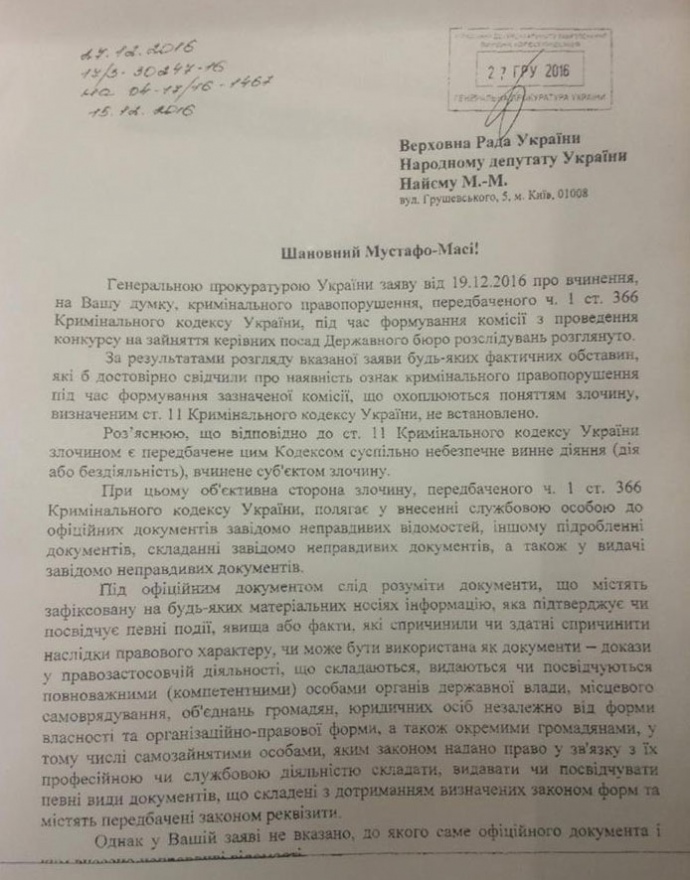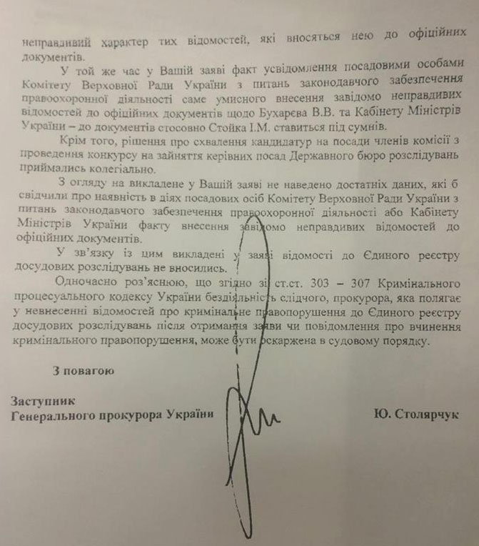 "Перший заступник Генпрокурора Юрій Столярчук написав відповідь, суть якої буквально зводиться до наступного: в своїй заяві ви не вказали, який саме документ неправильно підписали співробітники КМУ і ВР", - додав Найєм.