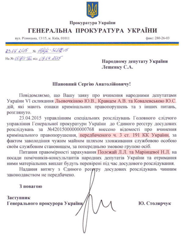 "Тепер трьом депутатам, які взяли на посади штатних помічників цих "фіктивних" працівниць, надали їм державне забезпечення, інкримінують злочини за статтею "розтрата майна шляхом зловживання службовим становищем", - повідомляє Лещенко з посиланням на відповідь з прокуратури.