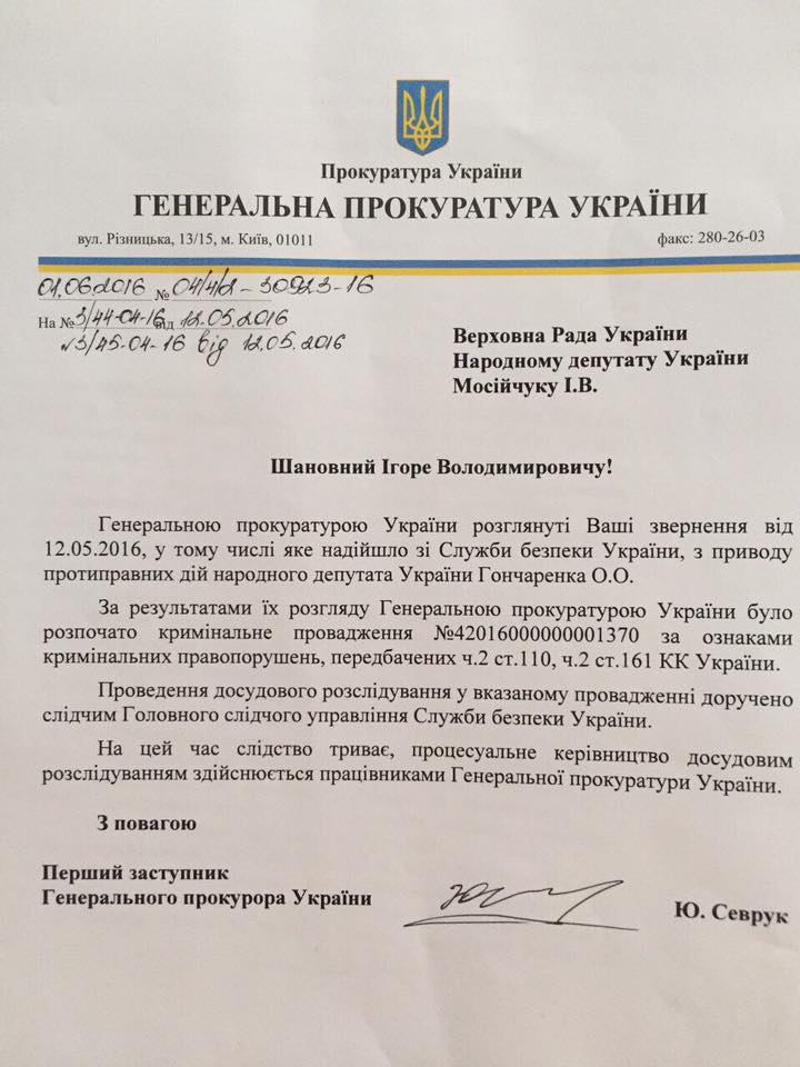 Це випливає з відповіді ГПУ на депутатське звернення нардепа від "Радикальної партії" Ігоря Мосійчука, яку розмістив у своєму Facebook депутат Андрій Лозовий. Відповідь датується 1 червня і підписаний Юрієм Севруком, який 3 червня пішов у відставку з посади першого заступника генпрокурора.