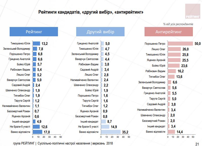 Що стосується антирейтингу політиків, то його стабільно очолює діючий президент Петьро Порошенко, рівень недовіри до якого складає 50%. Далі йдуть Олег Ляшко з 26%, та Юлія Тимошенко з 25,8%, Арсеній Яценюк з 25,5%, а також Юрій Бойко з 23,6%.