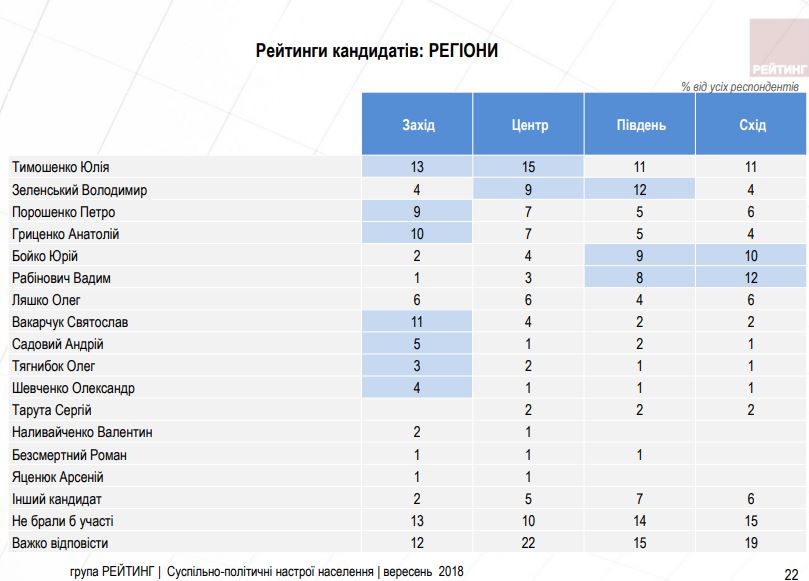 Згідно з опитуванням, 17% українців ще не визначились, якого кандидата підтримають на майбутніх президентських виборах, а 12% уже заявили, що не будуть голосувати. При цьому найбільше опитаних зараз готові підтримати Юлію Тимошенко, за яку готові віддати свої голоси 13,2% усіх опитаних. На другому місці опинився комік Володимир Зеленський, за якого готові проголосувати 7,8%, далі в рейтингу йдуть Петро Порошенко з 6,8%, та Анатолій Гриценко з 6,6% підтримки. На рівень нижче опинились Юрій Бойка (5,7%), Вадим Рабінович (5,4%), Олег Ляшко (5,2%) та Святослав Вакарчук (5,0%).