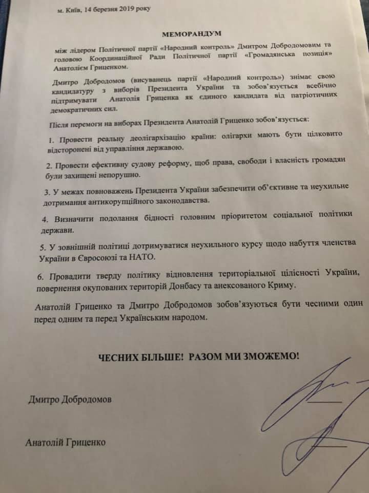 Кандидат в президенти, лідер партії "Громадянська позиція" Анатолій Гриценко та лідер партії "Народний контроль" Дмитро Добродомов у четвер, 14 березня, підписали спільний меморандум з ключовими засадами внутрішньої та зовнішньої політики. Про це повідомляє прес-служба Гриценка.