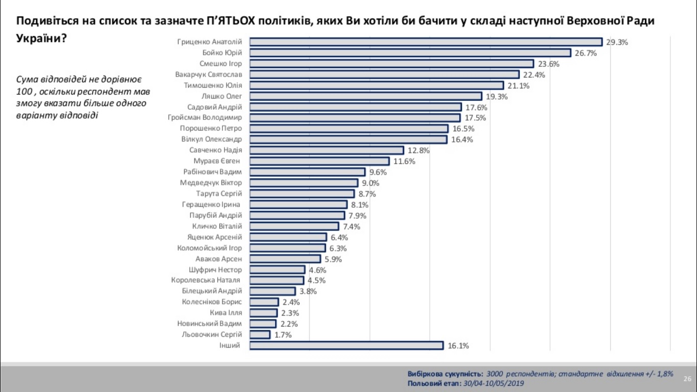 Топ-п'ять політиків, яких би хотіли бачити виборці у складі наступної Верховної Ради України складають лідер партії "Громадянська позиція" Анатолій Гриценко (29,3%), член політ сили "Опозиційна платформа – За Життя" Юрій Бойко (26,7%), голова патрії "Сила і честь" Ігор Смешко (23,6%), лідер новоствореної партії "Голос" співак Вакарчук (22,4%) та голова партії "Батьківщина" Юлія Тимошенко (21,1%). Такі дані соціологічного опитування представили центр "Соціальний моніторинг", Український інститут соціальних досліджень імені Олександра Яременка та Соціологічна група "Рейтинг".