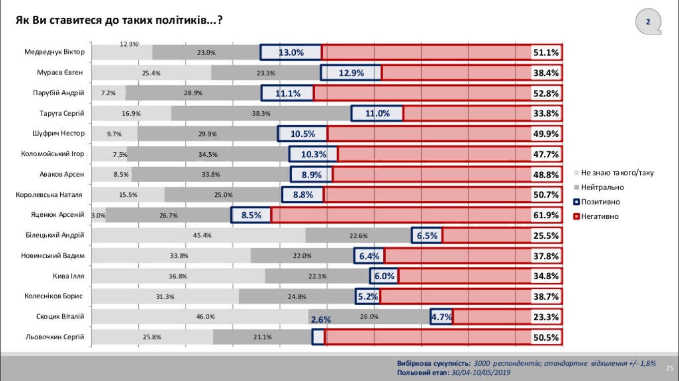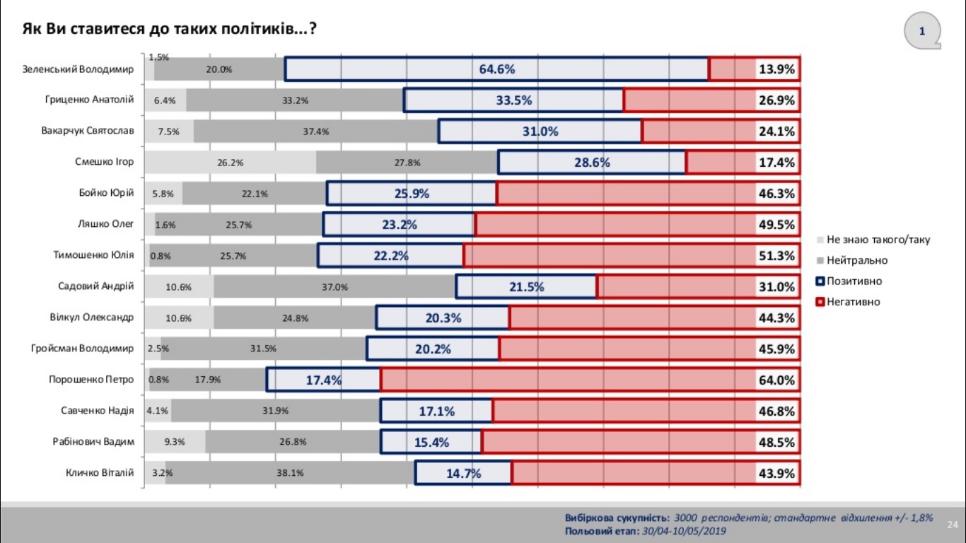 При цьому найбільш позитивно українці сприймають новообраного президента Володимира Зеленського, якому симпатизують 64,6% громадян та негативно сприймають 13,9%, на другому місці Анатолій Гриценко із 33,5% позитивного ставлення та 26,9% негативного сприйняття, до Святослава Вакарчука позитивно ставляться 31% проти негативного 24,1%. Далі у списку Ігор Смешко, Юрій Бойко, Олег Ляшко та Юлія Тимошенко.