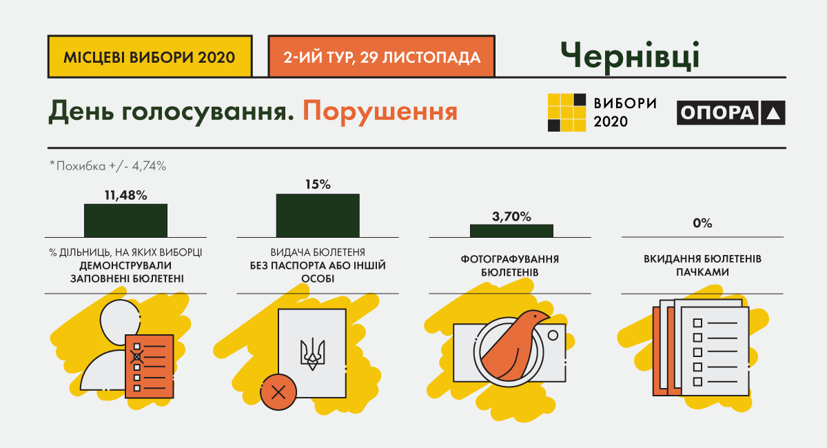 Крім того, під час голосування за міського голову Чернівців проявилася проблема розголошення таємниці голосування. Мова йде про демонстрацію виборцем бюлетеня і/або його заповнення за межами кабінки для голосування. Такі випадки спостерігачі ОПОРИ зафіксували на 11,48% дільничних виборчих комісій. Ще на 3,7% зафіксовано спроби виборців сфотографувати бюлетень.