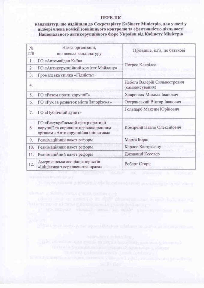 Згідно з документом, організації "Автомайдан Київ", "Антикорупційний комітет Майдану" і громадська спілка "Гідність" запропонували призначити аудитором НАБУ Петроса Клерідеса. Організація "Разом проти корупції" запропонувала кандидатуру Миколи Хавронюка; ГО "Рух за розвиток міста Запоріжжя" – кандидатуру Віктора Острянського; ГО "Публічний аудит" – Максима Гольдарба; ГО "Всеукраїнський центр протидії корупції та сприяння правоохоронним органам "Антикорупційна прокуратура" – Павла Комірчого.