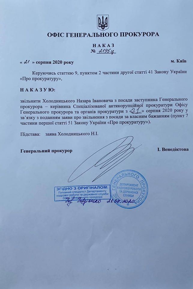Згідно з наказом, який вже підписала генпрокурорка Ірина Венедиктова, Холодницький пішов за власним бажанням. При цьому його в цілому звільнили з органів прокуратури.