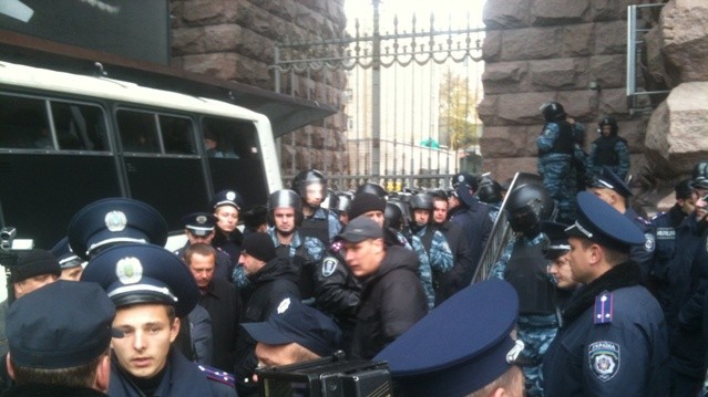 Перший поверх мерії також повністю заповнено "Беркутом". Журналісти, які встигли прийти в будинок до 07.30, перебувають на першому поверсі. Секретар Київради Галина Герега пообіцяла провести брифінг о 9.00.