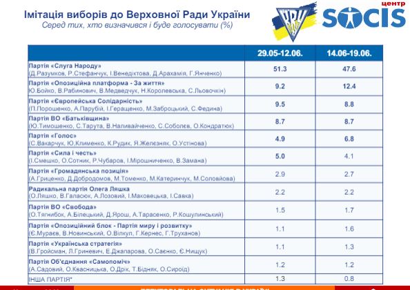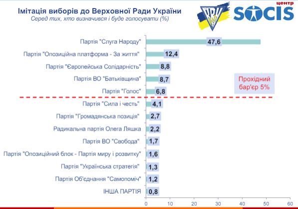 Згідно з результатами соцопитування, партію "Слуга народу" серед тих, хто вже визначився зі своїм вибором і буде голосувати на позачергових виборах народних депутатів мають намір підтримати 47,6% респондентів "Опозиційну платформу – За життя" – 12,4%, "Європейську солідарність" – 8,8%, "Батьківщину" – 8,7%, "Голос" – 6,8%, "Сила і честь" – 4,1%.