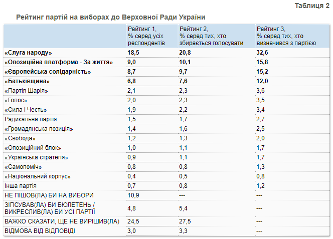 На початку квітня підтримати партію влади були готові 38,1% опитаних (згідно з опитуванням групи "Рейтинг"), зараз – 32,6%. Друге і третє місце з мінімальним відривом ділять "Опозиційна платформа-За життя" (15,8%) і "Європейська солідарність" (15,2%).