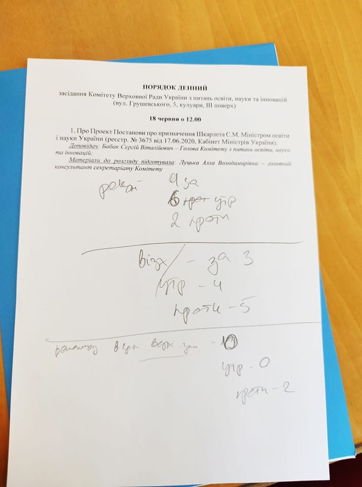 "Рішення комітету Освіти: Не рекомендували Шкарлета, але в зал винесли на голосування!", - написала вона у своєму Facebook, додавши до допису фото рішення. Причину такого рішення вона не уточнила.