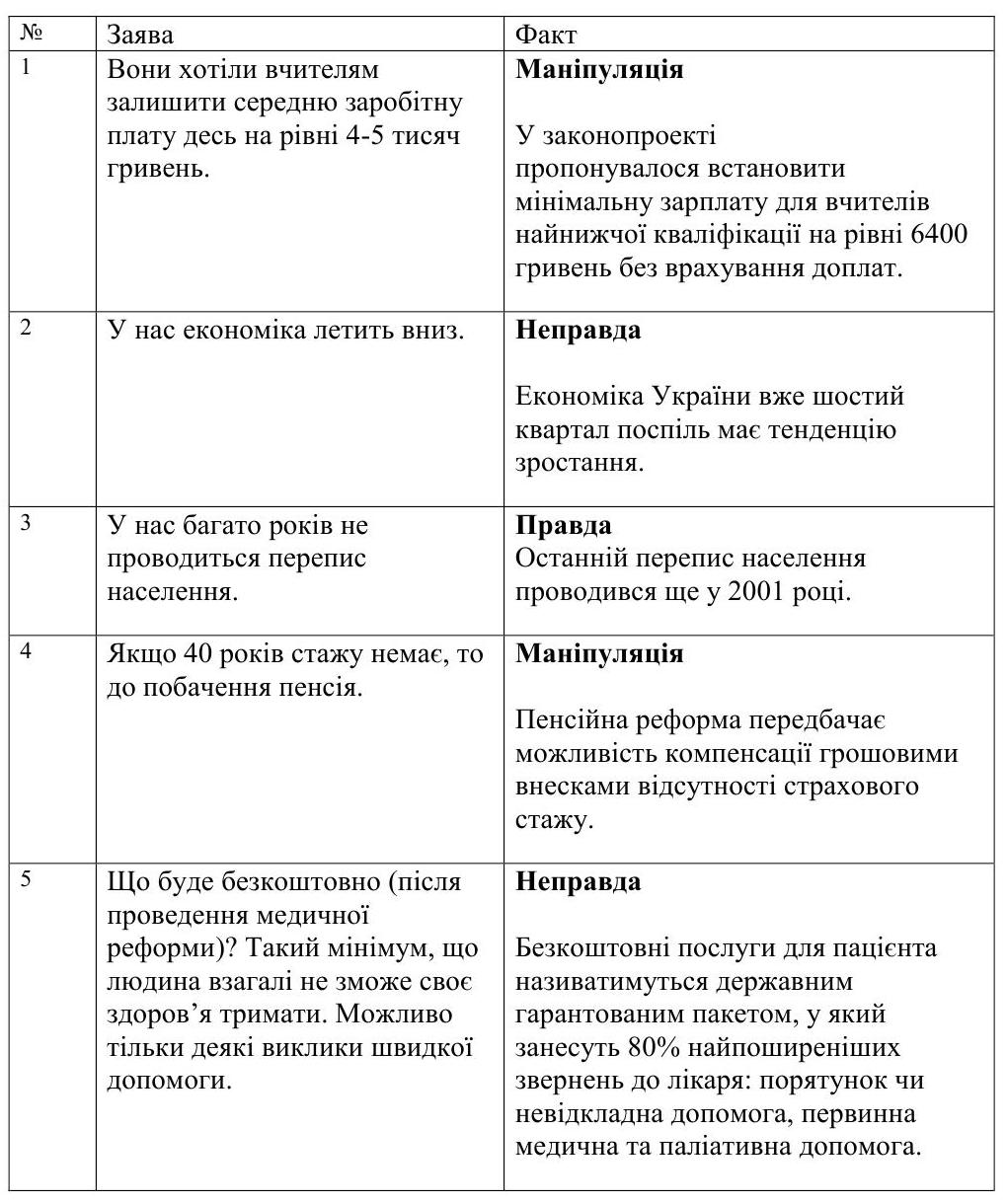 Для аналізу відібрали кілька фактів, на які спиралася Юлія Тимошенко. З п'яти проаналізованих заяв чотири виявилися неправдивими або маніпулятивними.