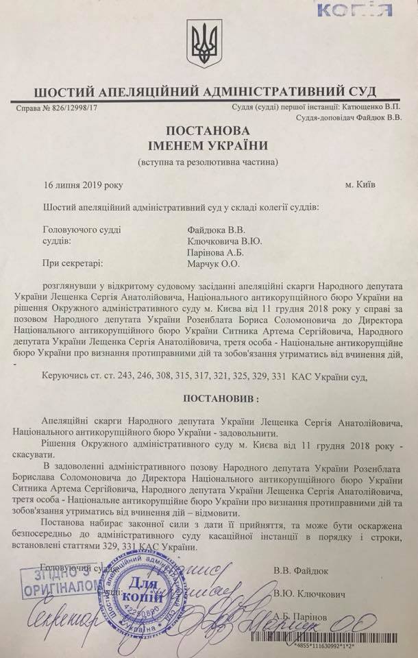 Народний депутат Сергій Лещенко опублікував рішення Шостого апеляційного суду, який відмовив у позові проти Лещенка у справі про ймовірне втручання у вибори президента США в 2016 році.
