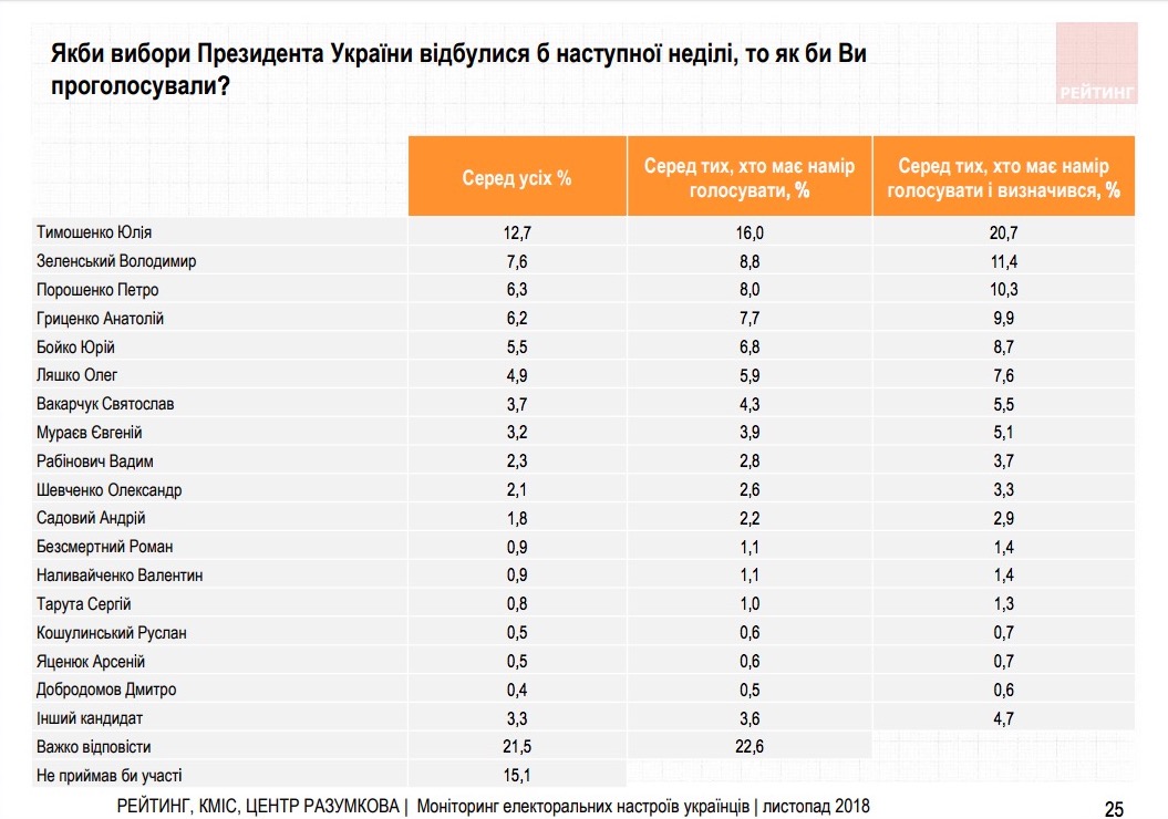 Згідно з даними опитування, за Тимошенко готові проголосувати на президентських виборах 12,7% серед усіх опитаних, за Зеленського – 7,6%, за Порошенка – 6,3%, за Гриценка – 6,2%.