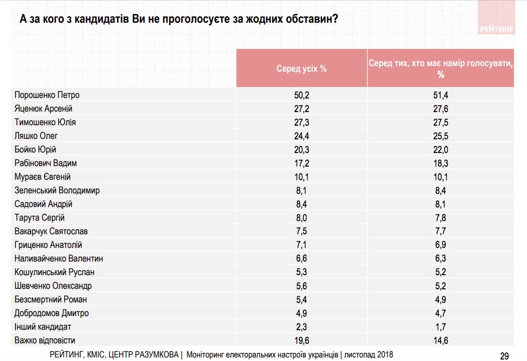 Антирейтинг очолює чинний президент – 50,2% серед усіх опитаних українців не проголосують за нього за жодних обставин. На другому місці з практично однаковими результатами колишній прем'єр Арсеній Яценюк – 27,2% та Юлія Тимошенко – 27,3%. На третьому – Ляшко (24,4%).