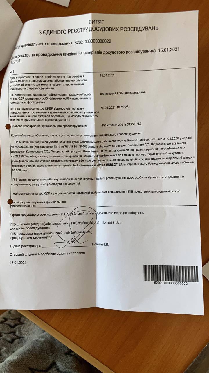 Проти генерального прокурора України Ірини Венедиктової відкрито кримінальне провадження по ч.3 ст. 229 ККУ - незаконне використання службовою особою товарних знаків. Йдеться про те, що чиновниця незаконно носила фейковий годинник Hublot, який до цього не задекларувала, але згодом надала довідку про те, що годинник не справжній. Про це на своїй сторінці в Фейсбук повідомив головний експерт StateWatch Олександр Лємєнов.