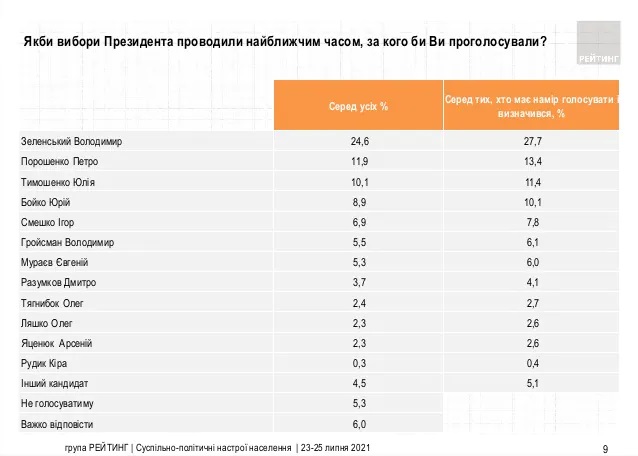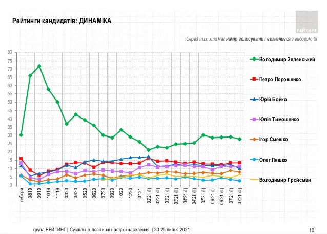 Якби вибори проводилися найближчим часом, 27,7% (29,1% у червні) проголосували б за Володимира Зеленського (серед тих, хто голосуватиме та визначився з вибором), 13,4% підтримали б Петра Порошенка, 11,4% – ЮліюТимошенко, 10,1% – Юрія Бойка.